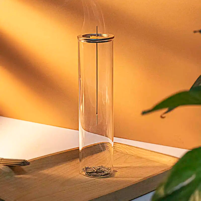 Our design features a glass dome with removable metal prong lid. Simply place the incense stick upside down pinching it between the gap and allow to smoulder & ash to fall onto the base.