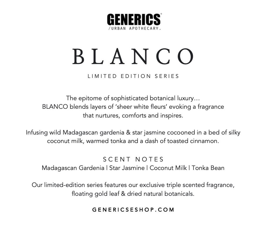 An exclusive triple layered fragrance, BLANCO features in our our signature candles with floating gold leaf & dried botanicals.
