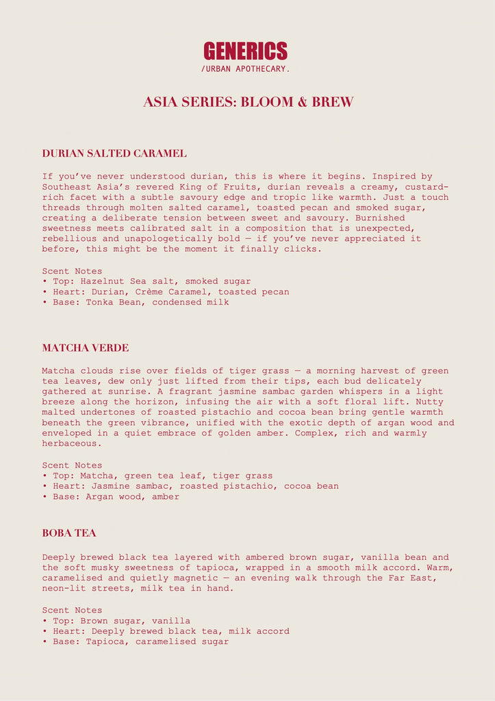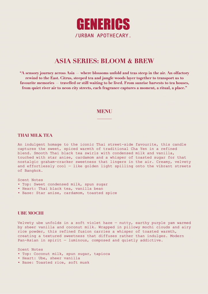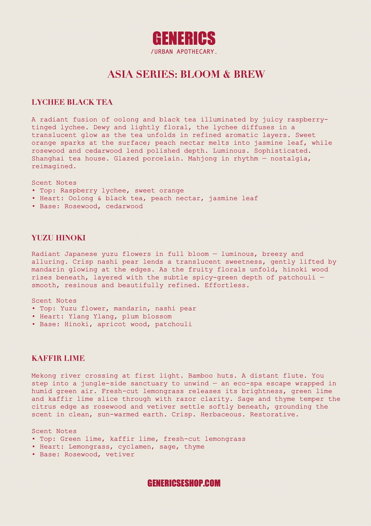 “A sensory journey across Asia — where blossoms unfold and teas steep in the air. An olfactory rewind to the East. Citrus, steeped tea and jungle woods layer together to transport us to favourite memories — travelled or still waiting to be lived. From sunrise harvests to tea houses, from quiet river air to neon city streets, each fragrance captures a moment, a ritual, a place.”